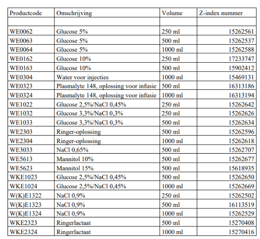 Door de gevolgen van orkaan Helena in Amerika is een productielocatie van Baxter International Inc. in North Carolina tijdelijk gesloten. In deze fabriek worden infuusvloeistoffen/ infuuszakken van verschillende volumina geproduceerd. Er worden per direct 25% minder infuuszakken aan Nederland geleverd. Het gaat specifiek om infuusvloeistoffen in zakken van 250, 500 en 1000 ml. Dit beschikbaarheidsprobleem geldt wereldwijd. Nederlandse ziekenhuizen die een contract hebben met Baxter, zullen dit direct merken. Maar ook andere ziekenhuizen, en andere zorgaanbieders, zullen merken dat er minder infuuszakken geleverd worden.
