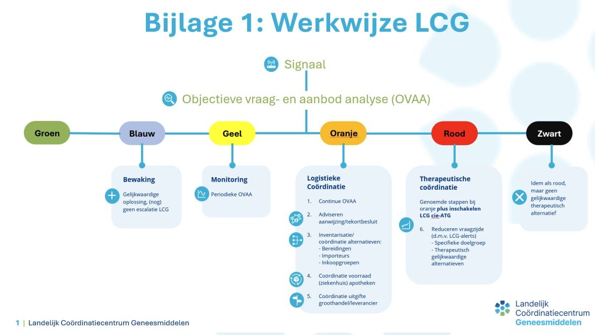 Inventarisatiefase: Wanneer er meldingen uit het veld komen, inventariseert het LCG of er sprake is van een (mogelijk) tekort. Het resultaat van de inventarisatiefase is een kleurcodering voor het betreffende middel. Onderstaand een definitie van de codering die door het LCG aan een middel gegeven kan worden.